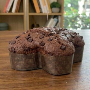 Impasto al cioccolato, senza glutine e senza lattosio, con scaglie di cioccolato fondente 60%.